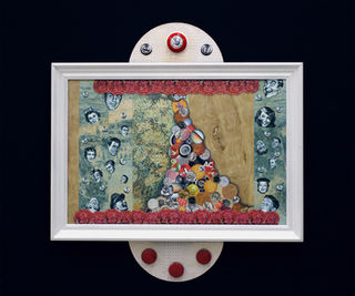 Collage, wallpaper, clock, telephone, light switch, clock mechanisms, sports trophy parts, acrylic knick-knack houses, tin cans, resin balls, wood blocks, camera flash bulbs, water faucet handles, Magic 8 Ball, oven temperature knob, wooden eggs, gameboard houses, spray paint & dry transfer numbers on wooden knick-knack shelves. 33h” x 48w” x 5.5d”